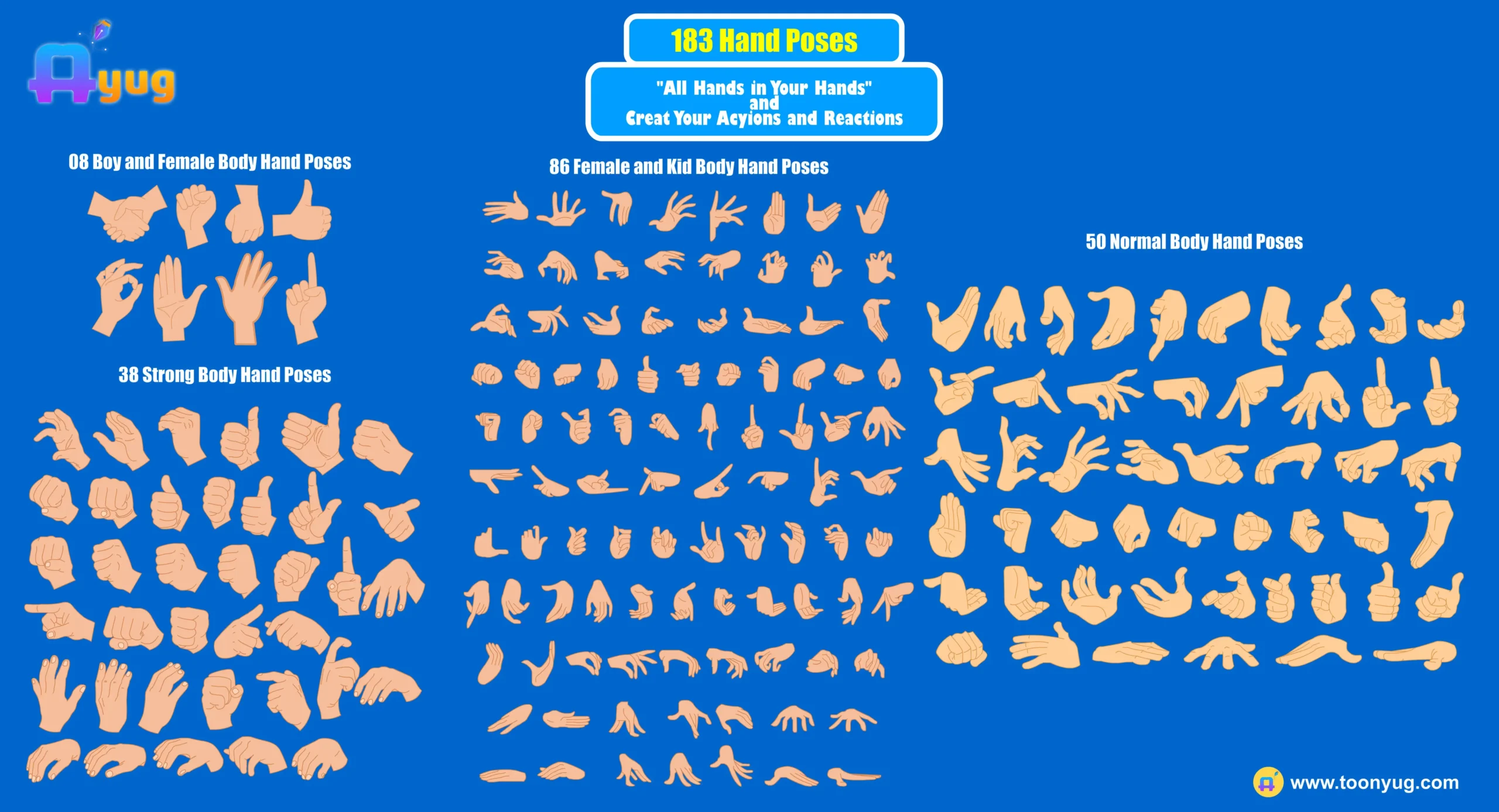 Take your character animations to the next level with the Toonyug Ultimate Hand Poses Pack! This massive library features 183 professionally designed hand gestures tailored to fit various body types and character styles. Whether you are creating a high-stakes action scene or a subtle emotional conversation, this pack provides every pose you need.