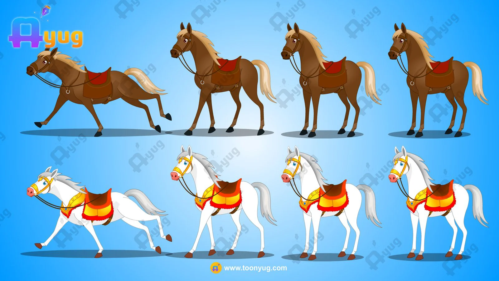 Product Overview: Bring high-speed action and royal elegance to your animation projects with this exclusive 2-Horse Asset Pack. Featuring a majestic White Horse and a powerful Brown Horse, this set is meticulously designed in Adobe Animate CC to meet the needs of historical epics, village stories, and mythological narratives like the Ramayan or Mahabharat.