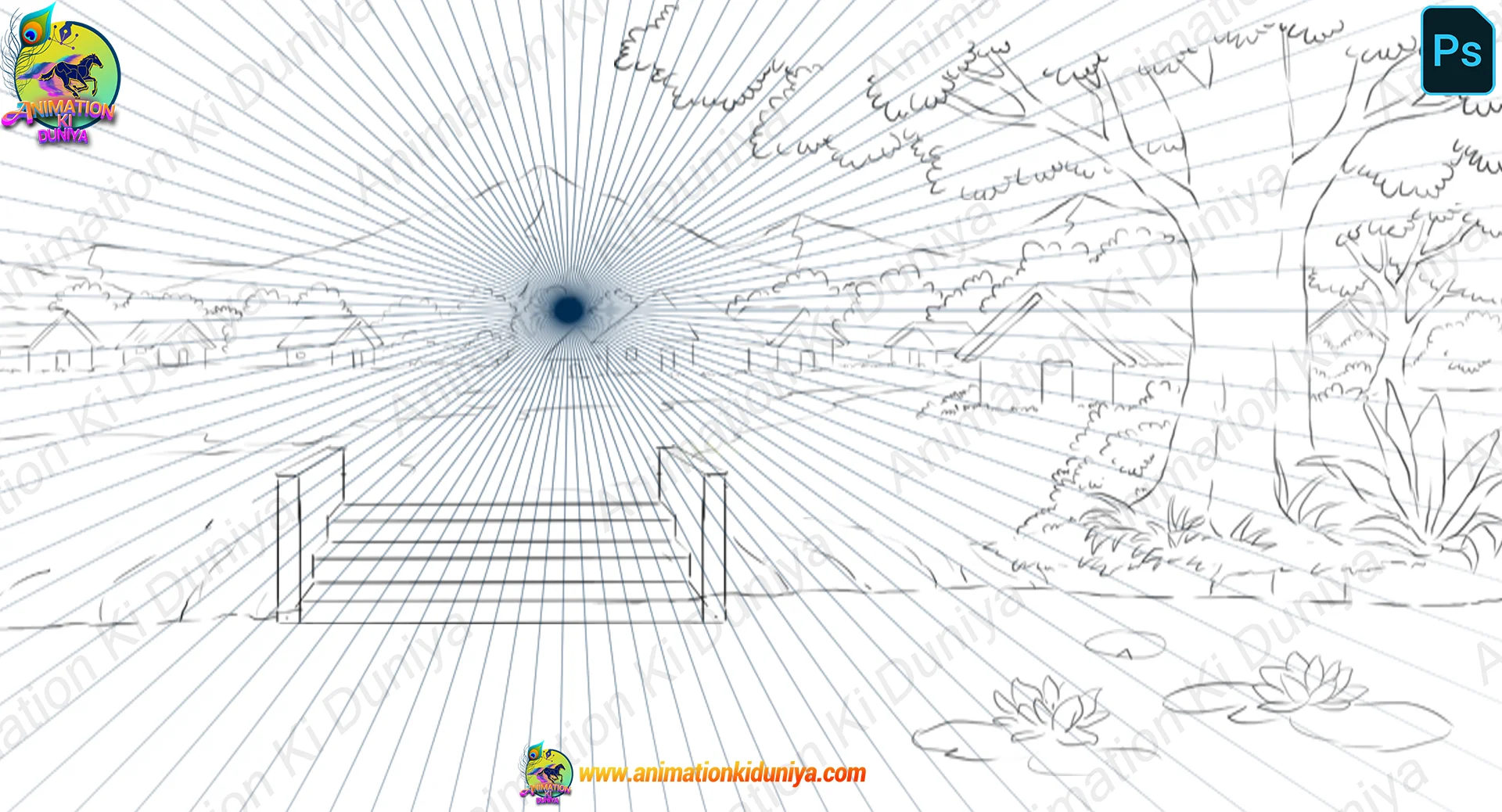 PSD फॉर्मेट (प्रीमियम सोर्स फाइल): यह पूरी तरह से एडिट करने योग्य फोटोशॉप फाइल है। कमल, नदी का पानी, सीढ़ियाँ, गांव की झोपड़ियाँ और पहाड़—सब कुछ अलग-अलग लेयर्स पर हैं।