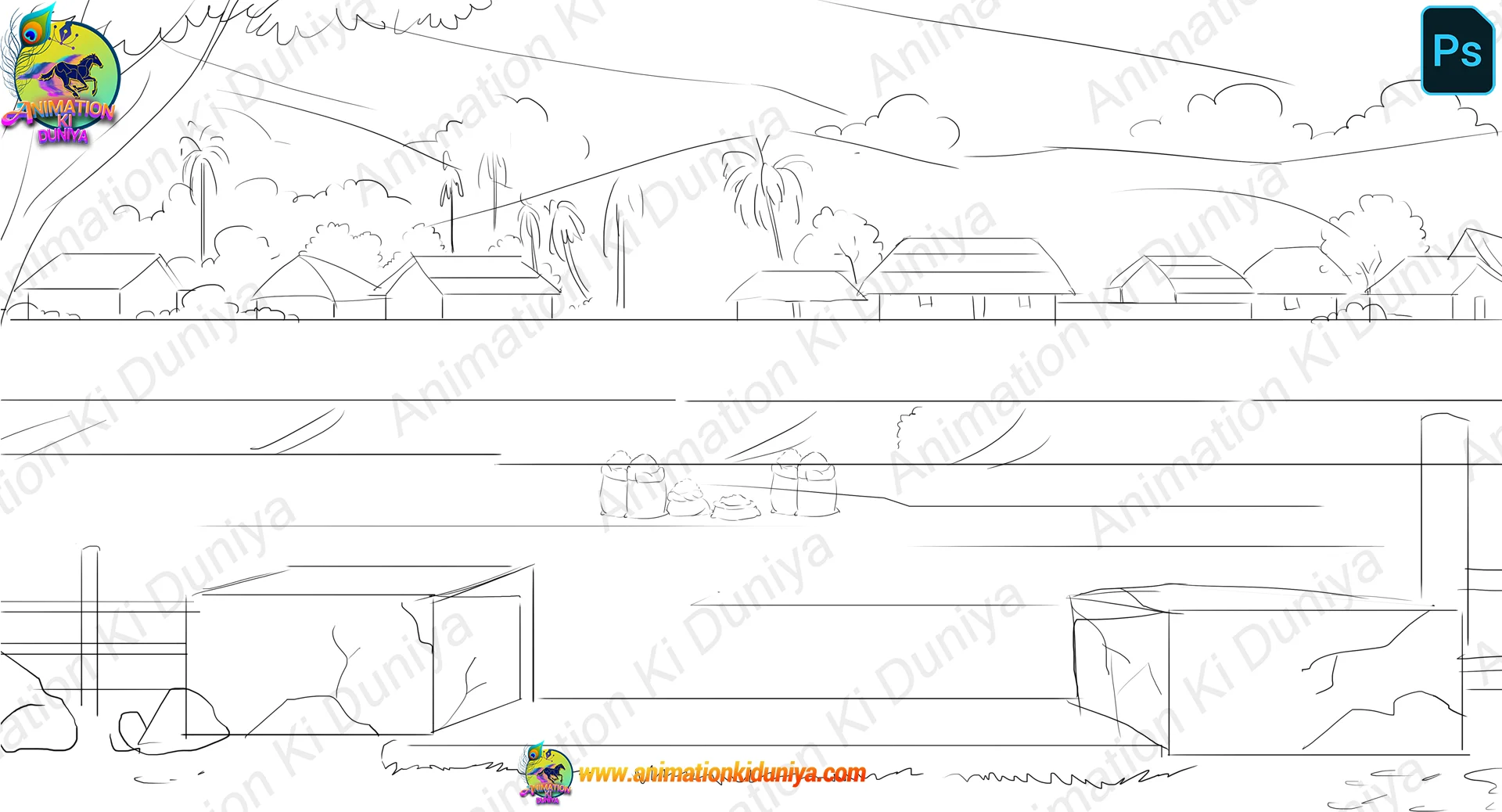 PSD फॉर्मेट (सोर्स फाइल): यह एक प्रोफेशनल लेयर्ड फाइल है। इसमें नदी, झोपड़ियाँ, पेड़ और पहाड़ अलग-अलग लेयर्स पर हैं।
