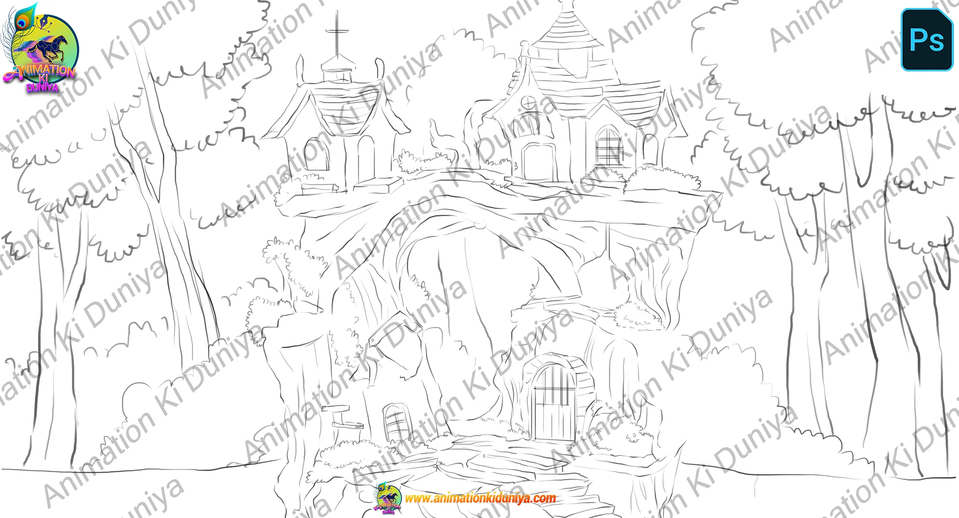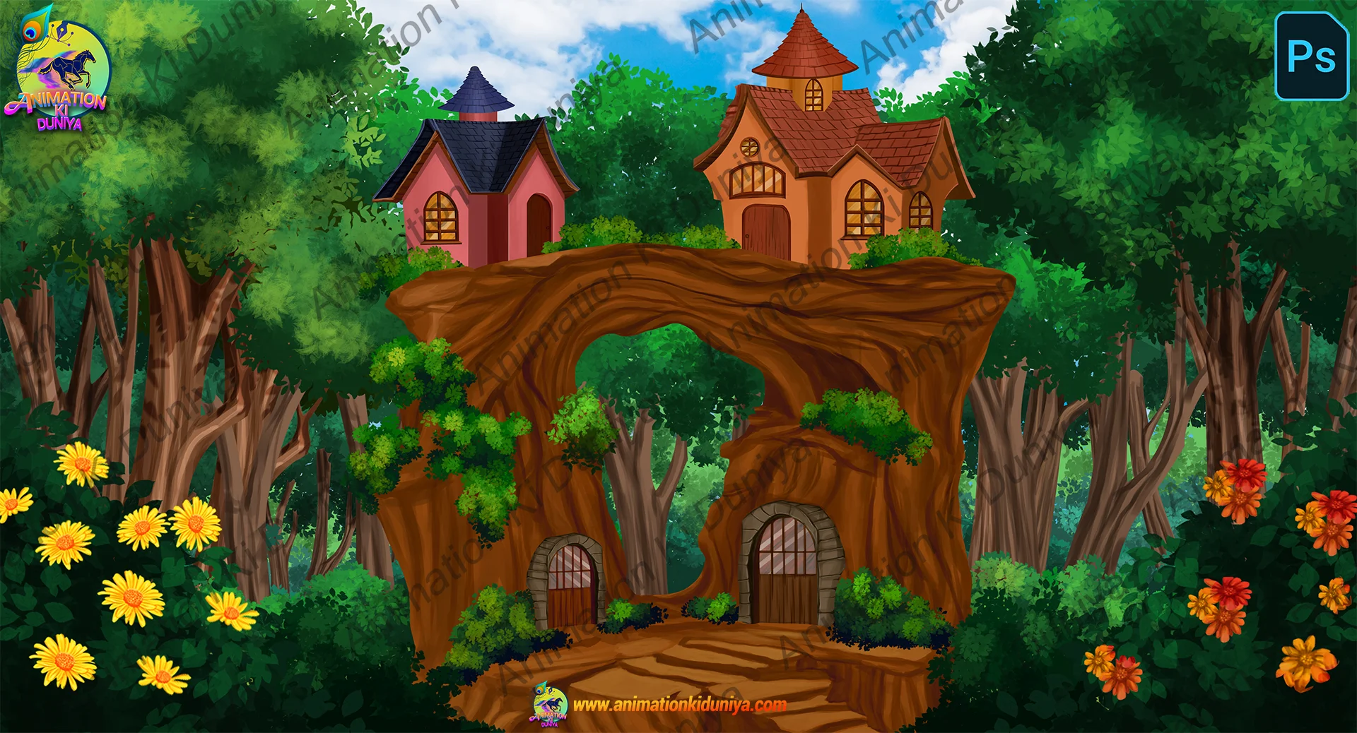 PSD वर्जन: पूरी तरह से लेयर्ड सोर्स फाइल। इसमें अलग-अलग घर, मुख्य पेड़ का मेहराब (arch), सामने के फूल और पीछे का जंगल अलग-अलग लेयर्स पर हैं। इससे आप कैरेक्टर को घरों के अंदर-बाहर दिखा सकते हैं और प्रोफेशनल पैरलैक्स डेप्थ बना सकते हैं।