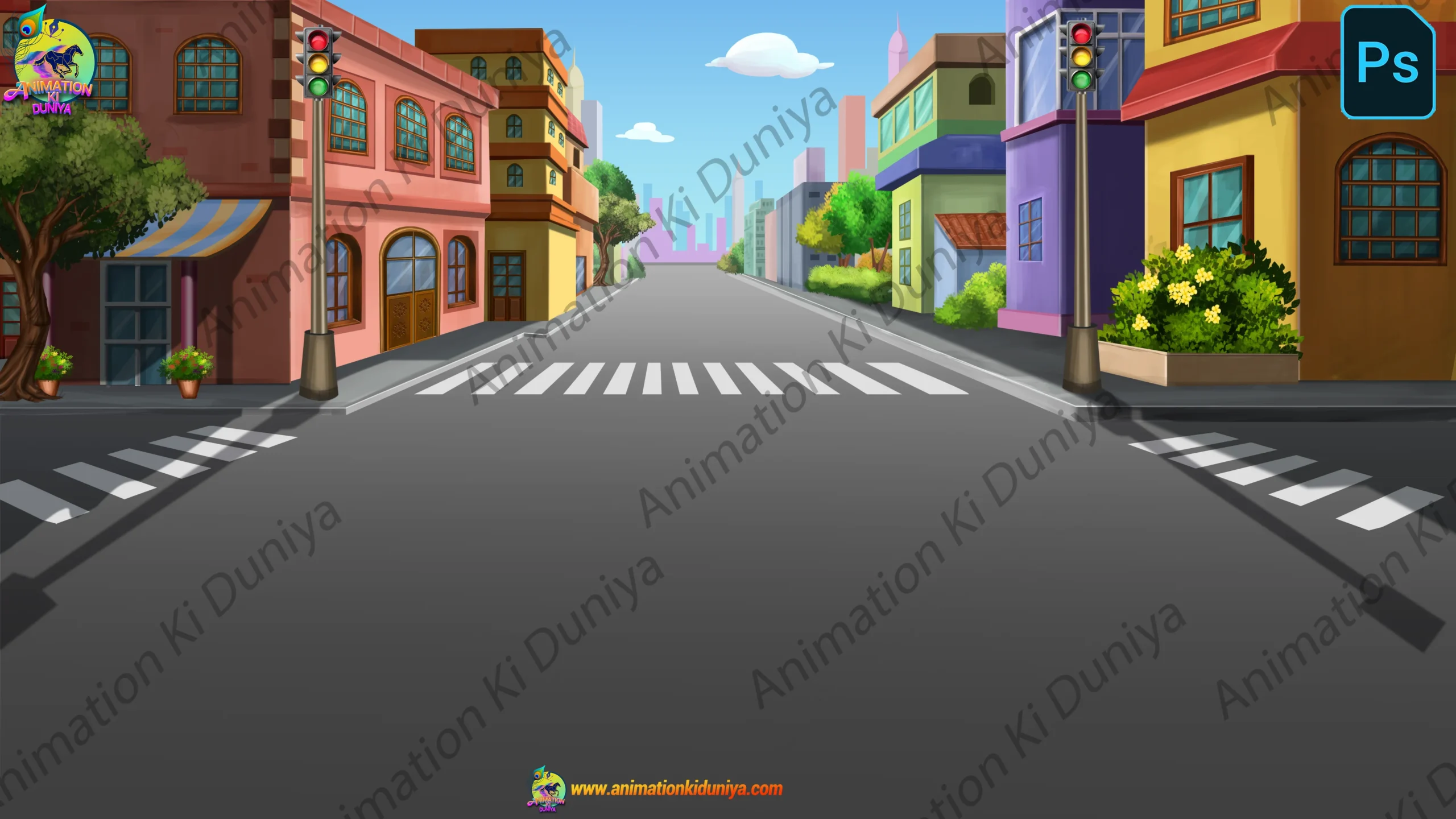 • Bring your urban stories to life with this vibrant 4K Cityscape background. This scene features a detailed street view with colorful buildings, traffic lights, a zebra crossing, and a clean asphalt road. It’s perfect for city-based adventures, school stories, or traffic awareness animations.