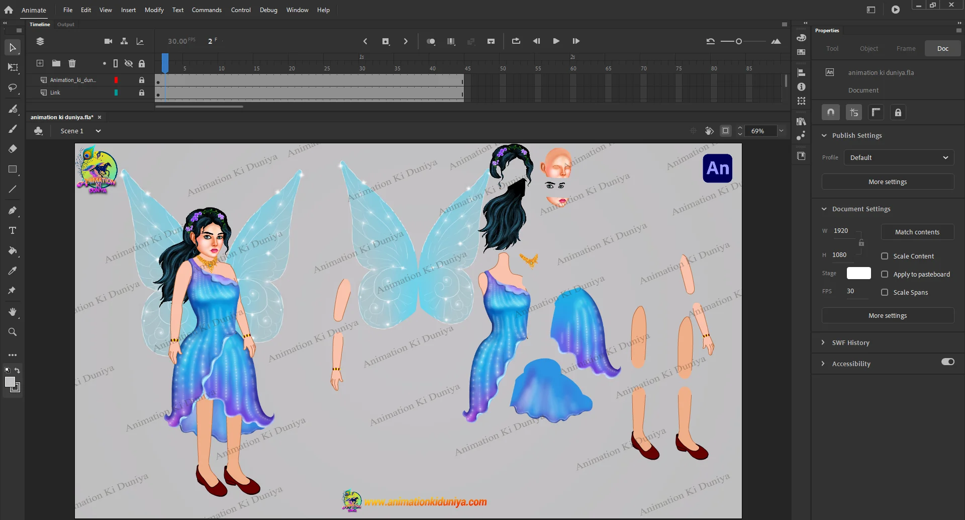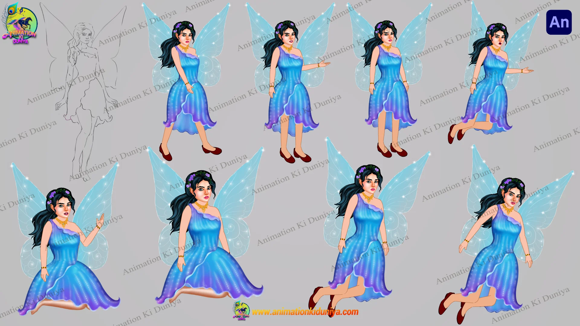 • Welcome to Toonyug Animation! Today we are showcasing a high-quality 2D Fairy character asset from “Animation Ki Duniya.” This character sheet is designed for professional 2D animators using Adobe Animate. It includes multiple poses like standing, sitting, and flying, perfect for fairy tales and kids’ stories.
