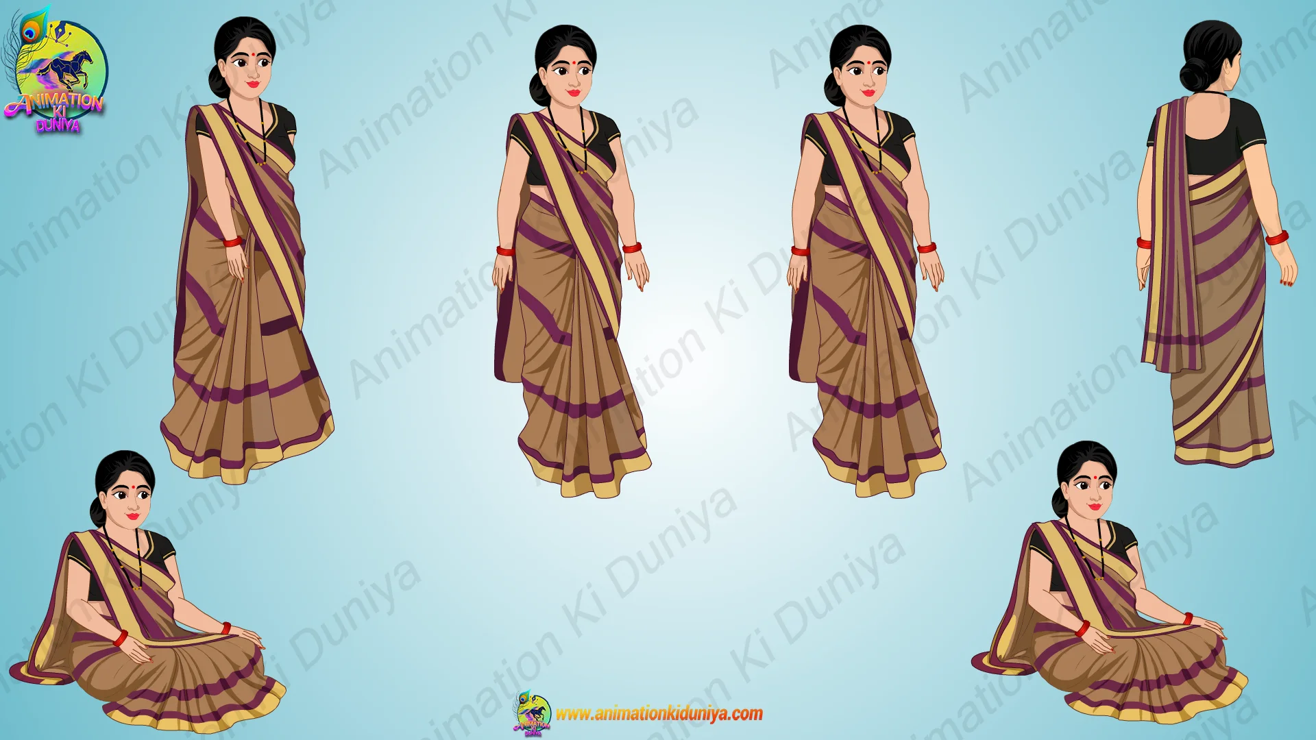 High-quality 2D vector character of a traditional Indian village woman in a brown and purple saree. Includes a full turnaround (front, side, back) and essential poses like walking and sitting. Perfect for rural life stories, social awareness videos, and moral tales.