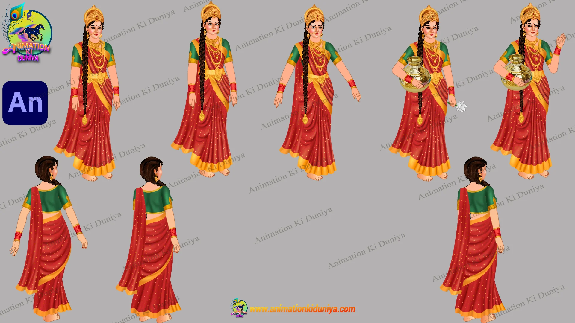 Bring divine elegance to your animation projects with this professionally crafted Goddess Lakshmi Ji character. This high-quality 2D vector asset is perfect for devotional stories, festival-themed content (Diwali), and Indian mythological series. The character is designed with traditional red saree, golden ornaments, and multiple poses to suit various storytelling needs.