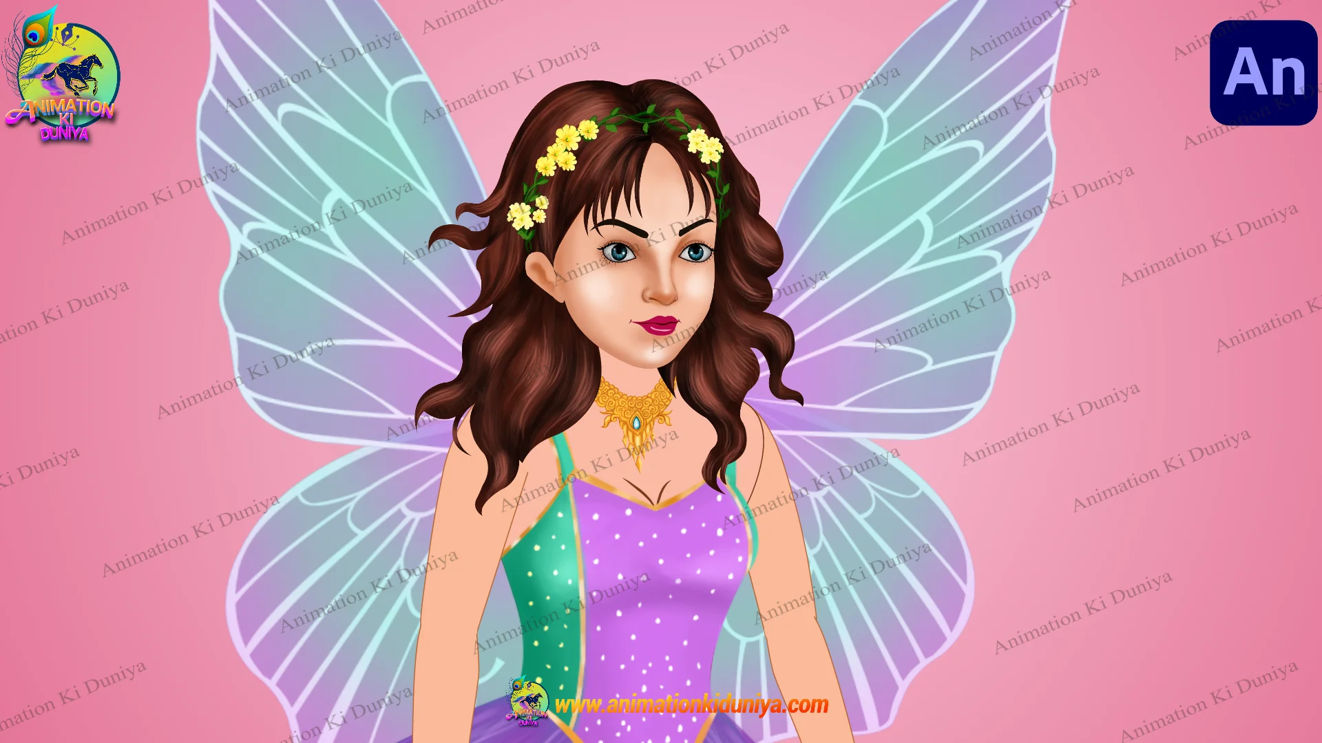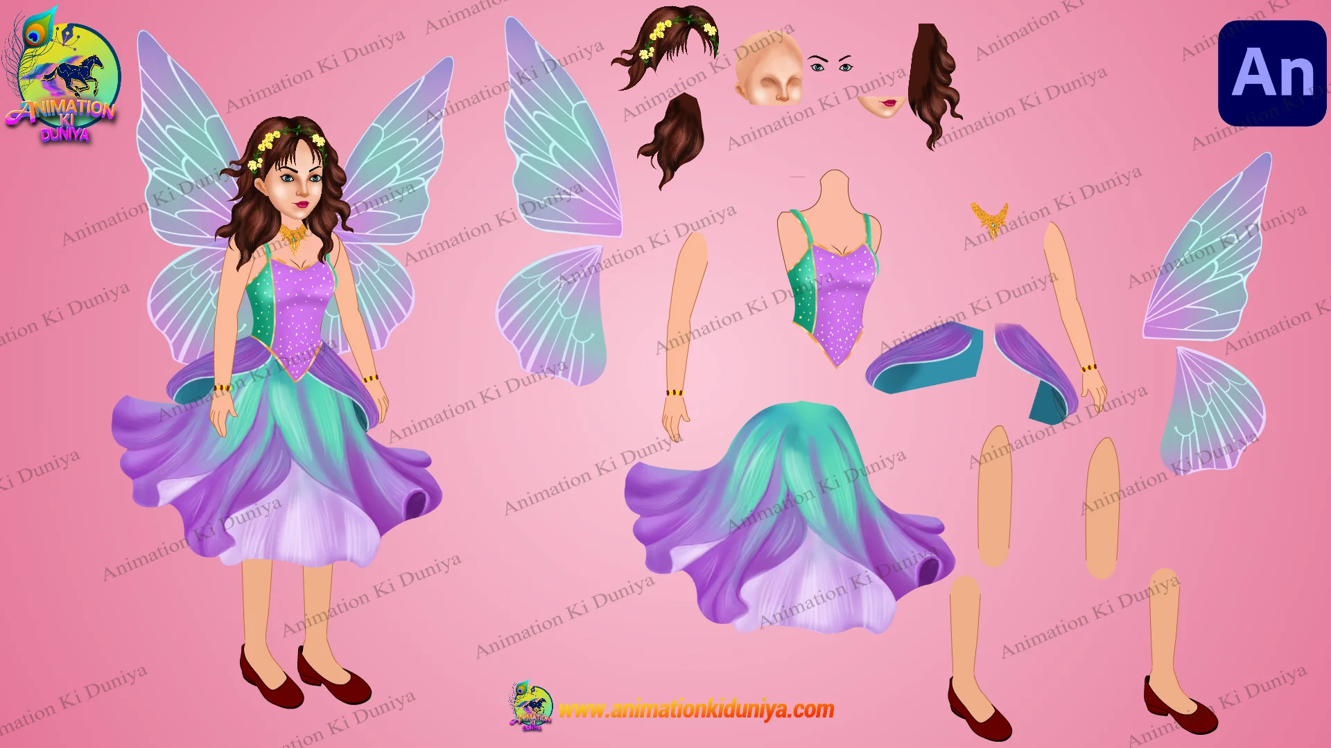 Bring magic to your animation with this high-quality Magical Fairy (Pari) character set. Featuring vibrant purple and teal wings and a beautiful floral dress, this character is perfect for fairytales and fantasy stories.