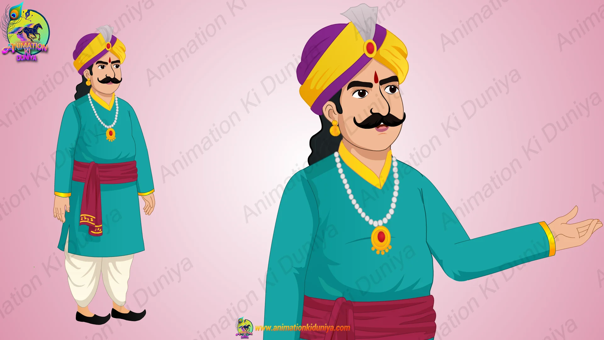 यह एक पारंपरिक भारतीय राजदरबारी मंत्री (Mantri) का उच्च गुणवत्ता वाला 2D वेक्टर कैरेक्टर डिज़ाइन है। इस कैरेक्टर शीट में खड़े होने, चलने, बात करने और बैठने जैसे विभिन्न पोज़ के साथ-साथ आगे, पीछे और साइड के दृश्य (Views) शामिल हैं। यह ऐतिहासिक, पौराणिक या लोक कथाओं पर आधारित 2D एनिमेशन के लिए एकदम सही है।