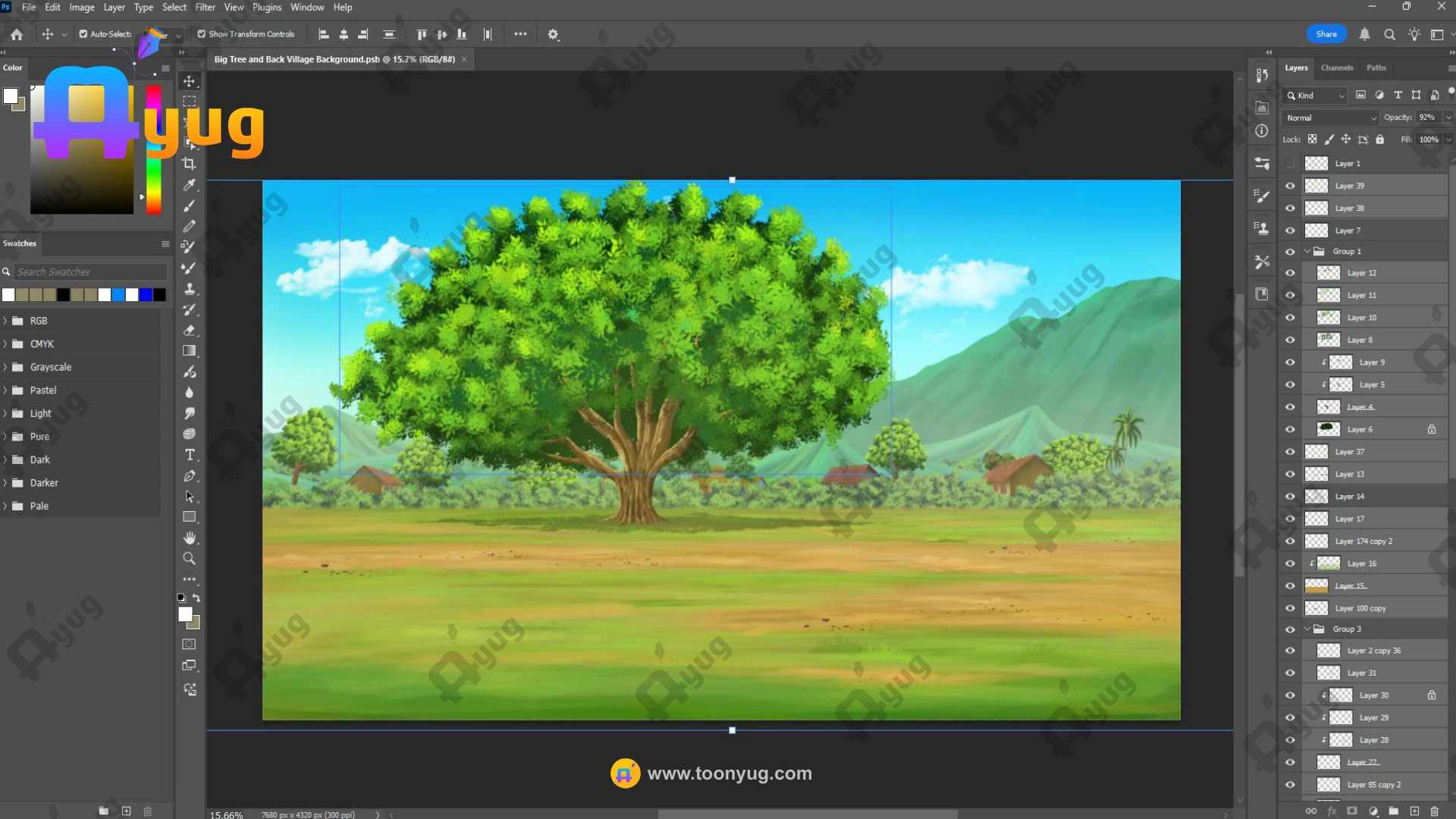 Layered Depth: The Big Tree, Background Mountains, Huts, and Sky are on separate layers. You can create a beautiful Parallax Effect where the mountains move slower than the tree as the camera pans.