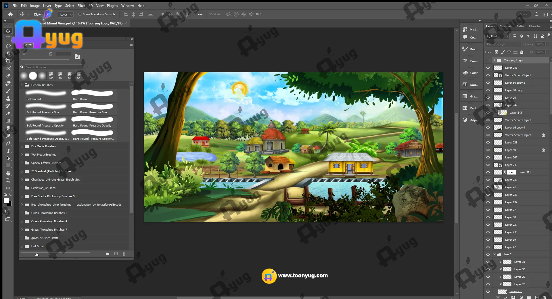 Product Overview: Create a magical atmosphere with this Indian Village Mountain View Background. This is not just a farm; it’s a picturesque landscape featuring rolling green hills, a winding path, and a serene village settlement. The scene includes unique elements like Water Canals/Steps, a Yellow House, and a Temple-like structure, all framed beautifully by large trees in the foreground.