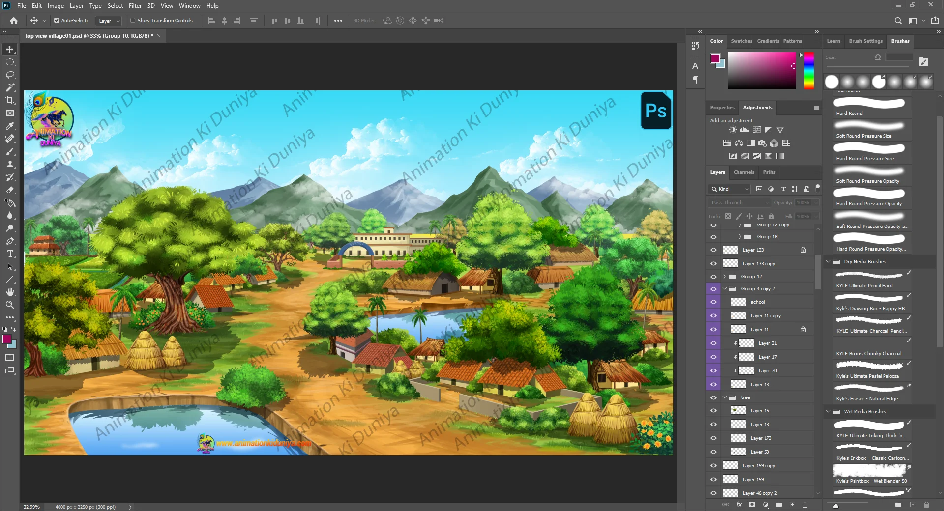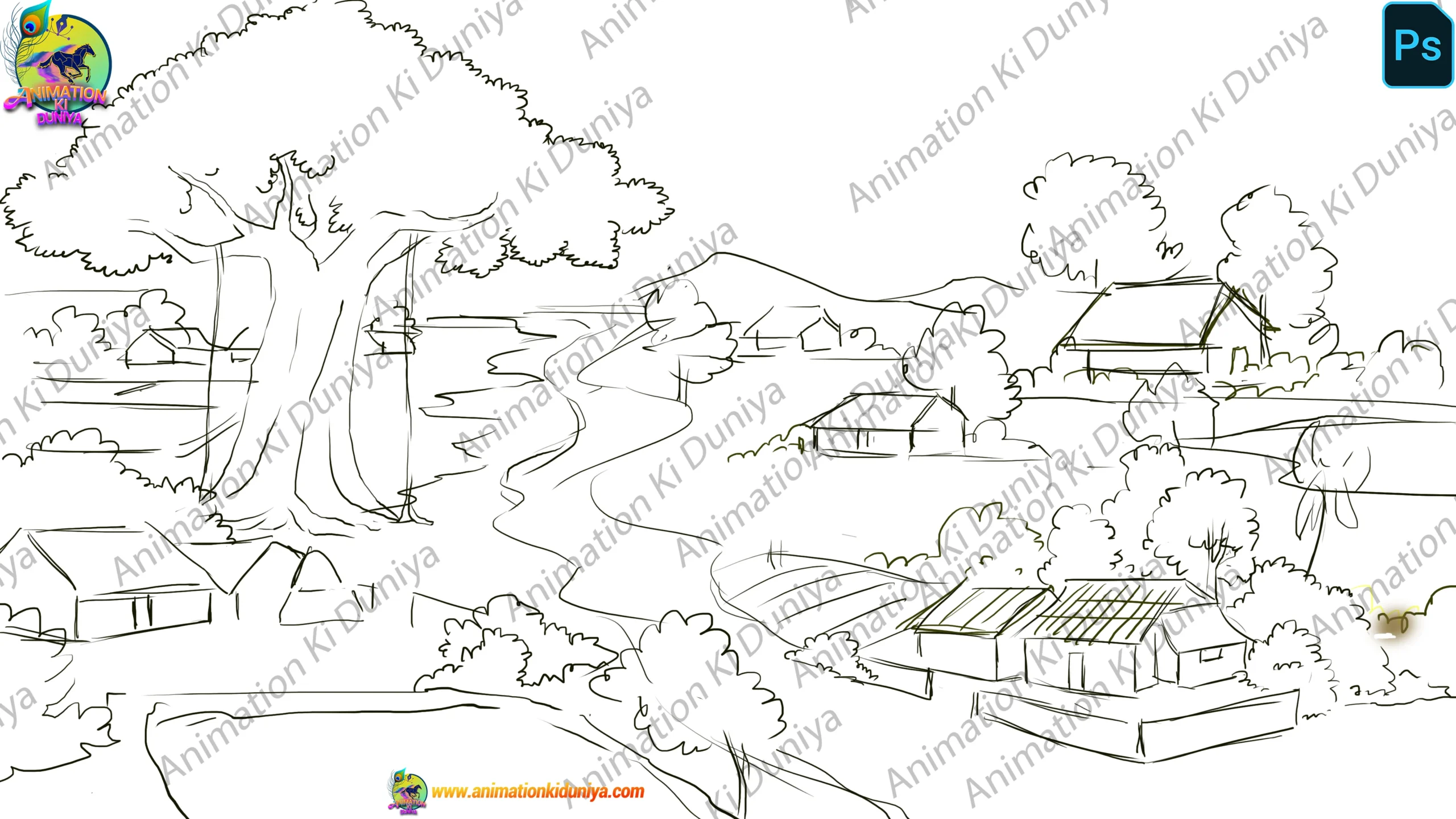 Enhance your 2D animation projects with this high-quality, vibrant Indian village background. This asset features a serene landscape with traditional huts, lush green trees, mountains, and a peaceful pond. Perfect for storytelling, cartoons, and educational videos.