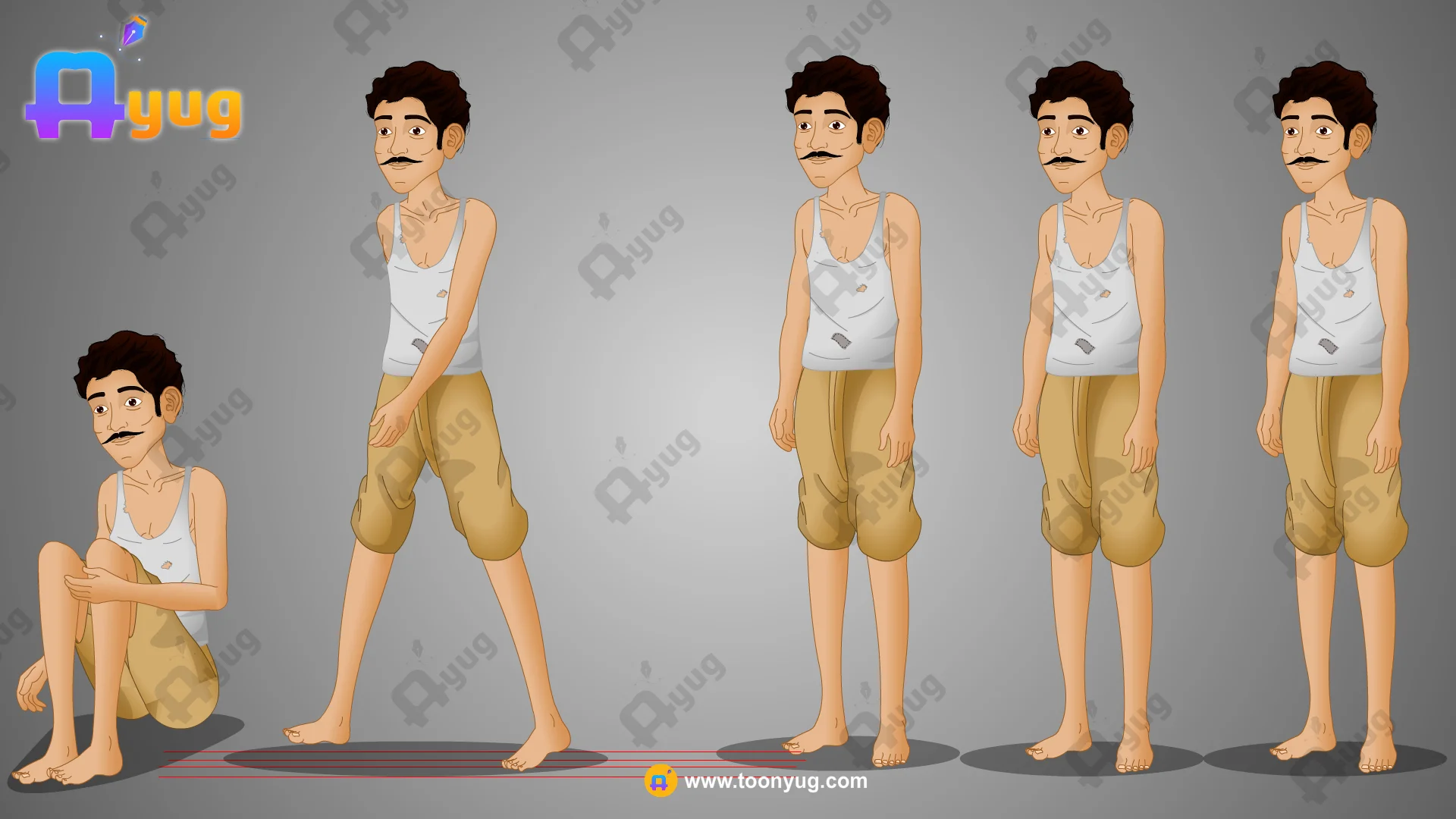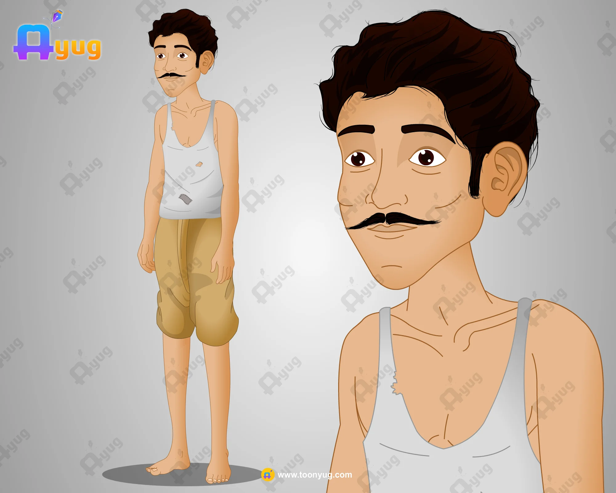 Ragged Clothing: Wears a dirty, torn white sleeveless vest (Baniyan) with visible holes, and short beige trousers/dhoti, symbolizing his lack of resources.