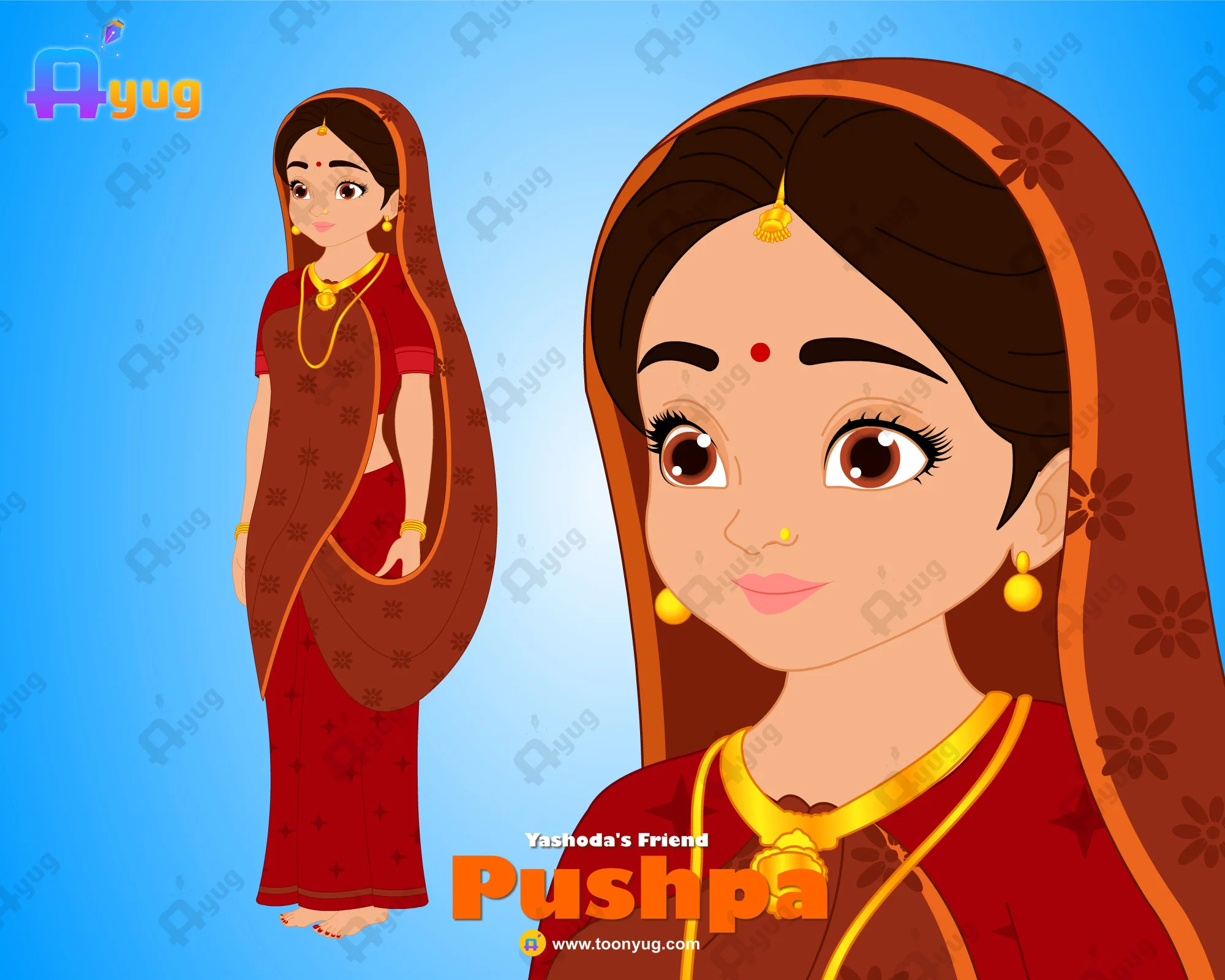 Traditional Gopi Aesthetic: Pushpa is adorned in a beautiful traditional saree and ethnic attire that authentically reflects the rich culture of Gokul.