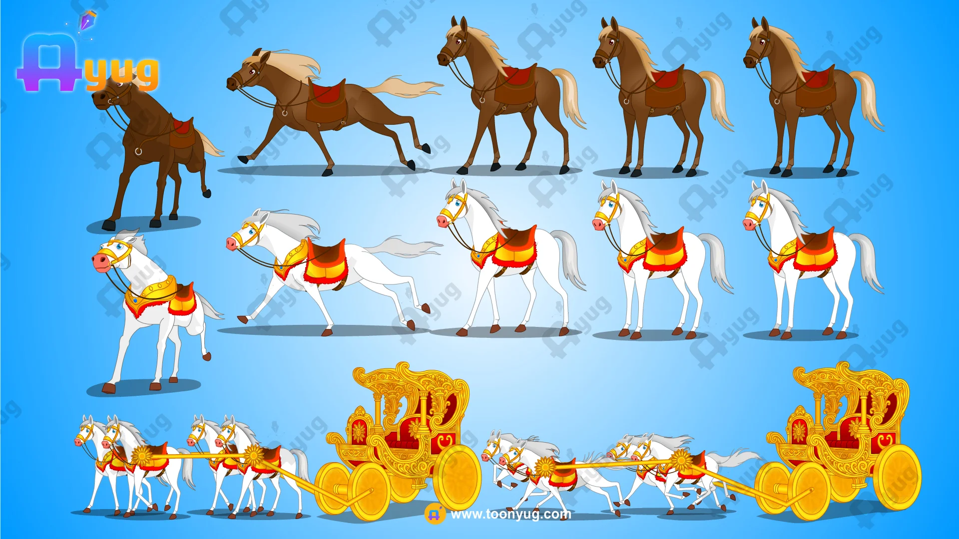 Product Overview: Create epic battle scenes or royal processions with this Ultimate Chariot & Horse Pack. Essential for the “Krishna Series,” Mahabharat, or Ramayan, this set includes a magnificent Golden Chariot (Rath) and two distinct horse breeds (Brown & White). Unlike static assets, these characters come with pre-designed run/walk poses, making it incredibly easy to animate a moving chariot scene.