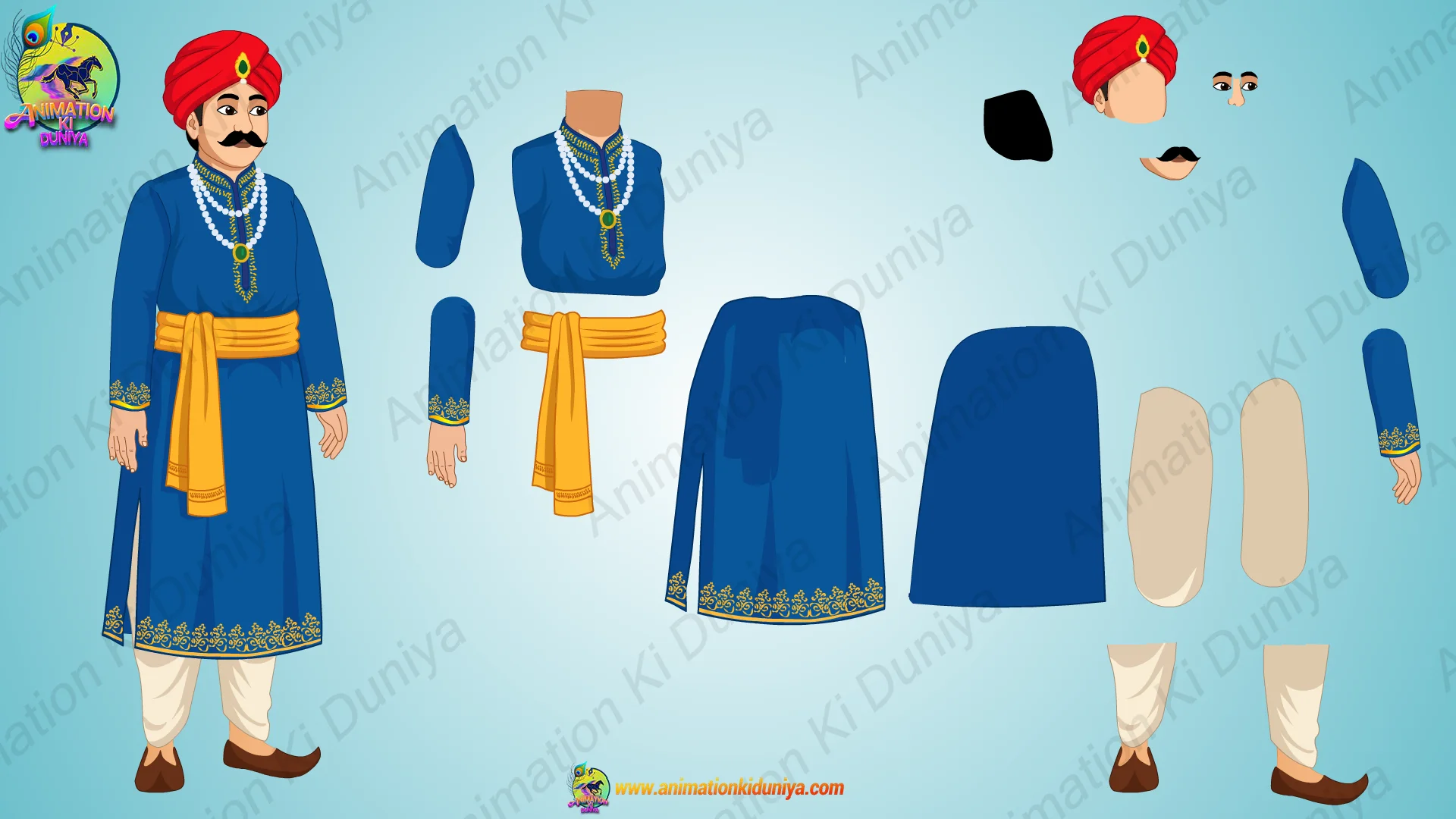 A premium 2D character of a Royal Indian Vazir (Minister) in a striking blue and gold outfit. This pack includes a complete turnaround (Front, Side, Back) and essential action poses like walking and sitting. Designed specifically for high-quality storytelling and 2D animation projects.