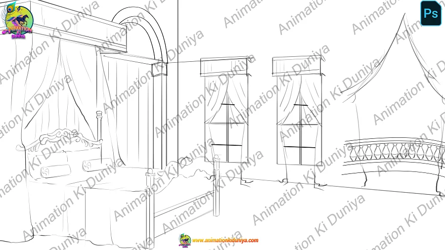 PSD फॉर्मेट: पूरी तरह से लेयर्ड प्रोफेशनल फाइल। इसमें शाही पर्दे, सोने का नक्काशीदार बेड, खंभे, अलमारी और बालकनी का दृश्य अलग-अलग लेयर्स पर दिए गए हैं।