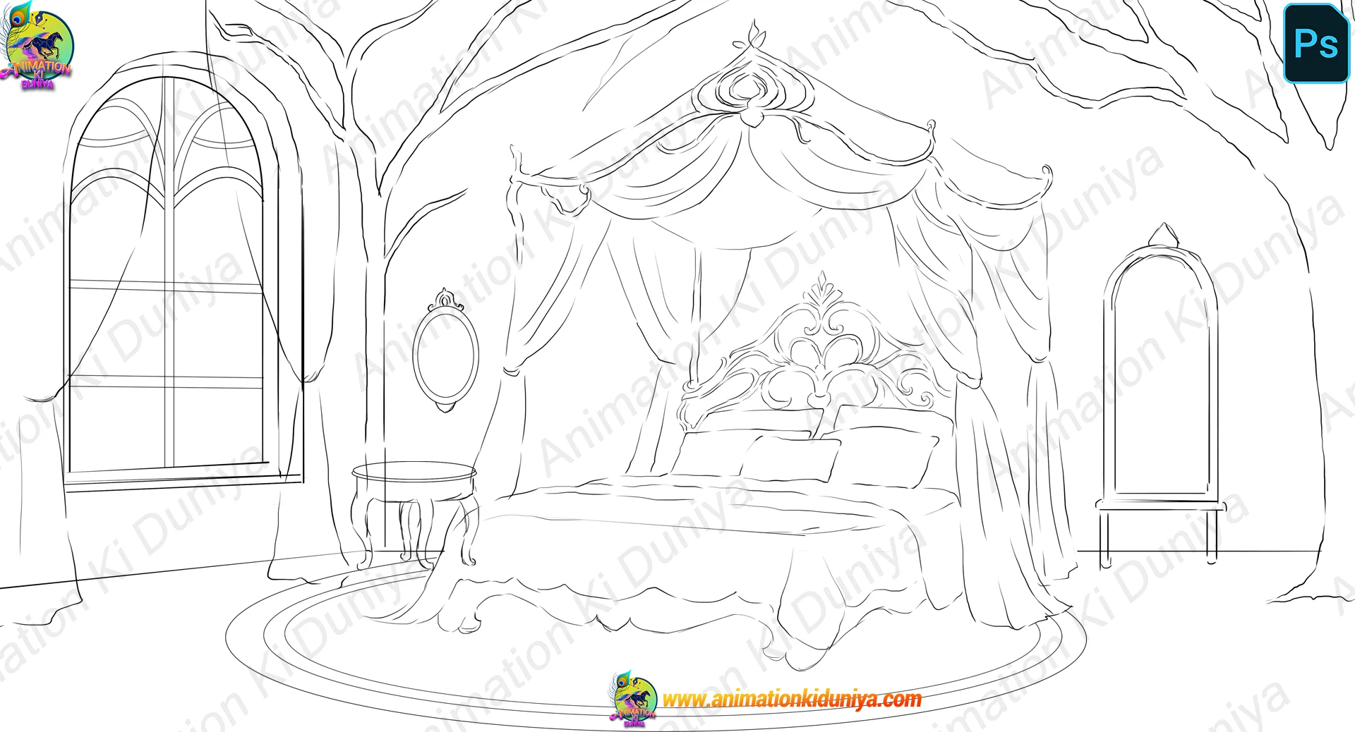 PSD वर्जन (प्रीमियम): यह एक पूरी तरह से लेयर्ड फाइल है। आप इसके बेड, टेबल और पेड़ों को अलग-अलग लेयर्स पर कंट्रोल कर सकते हैं, जिससे एनीमेशन में गहराई (Depth) देना आसान हो जाता है।