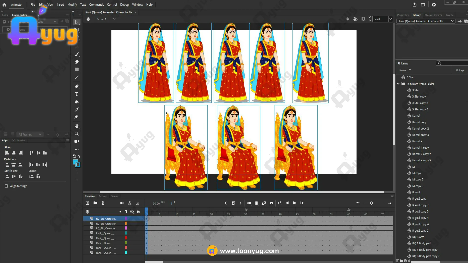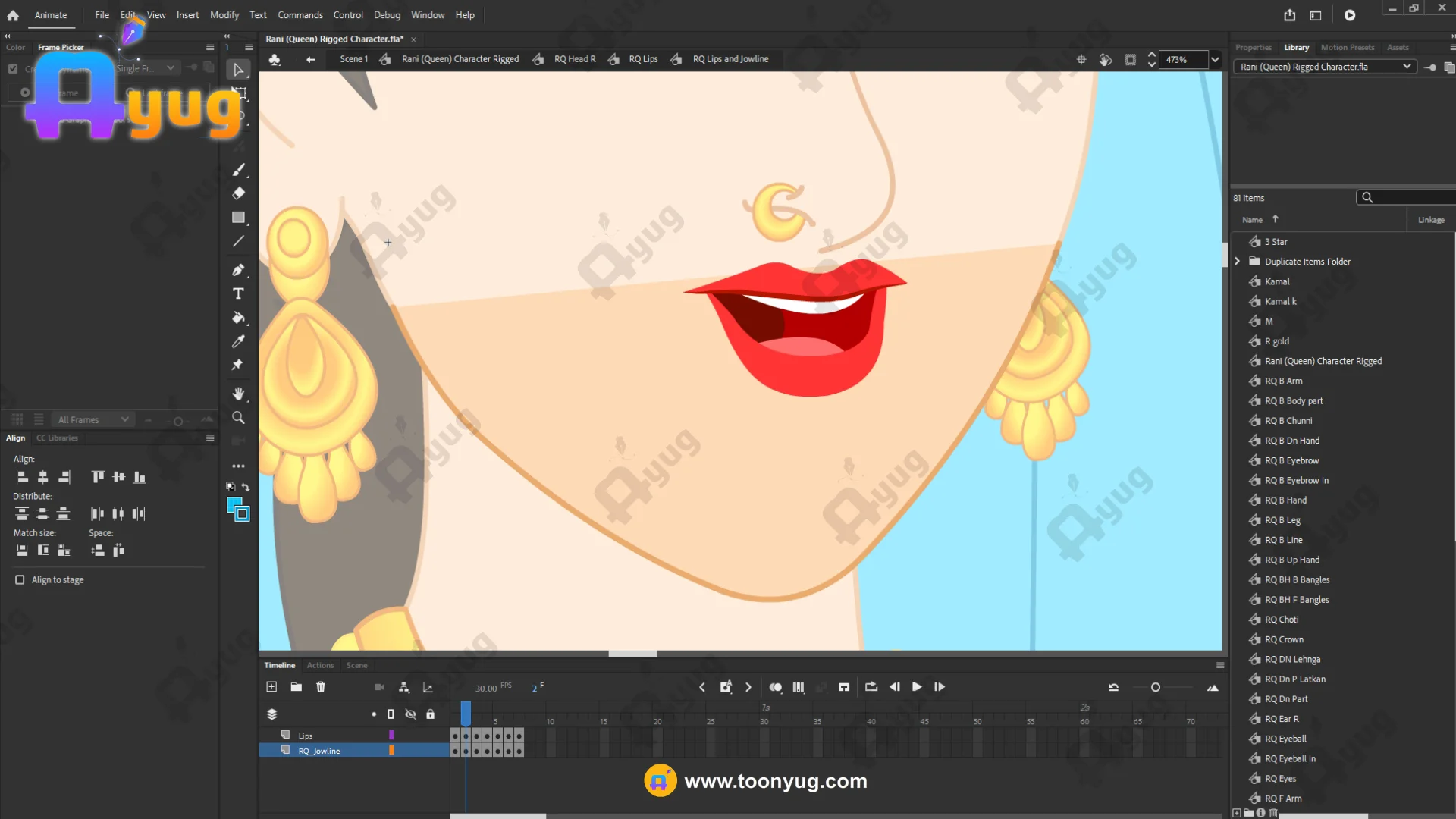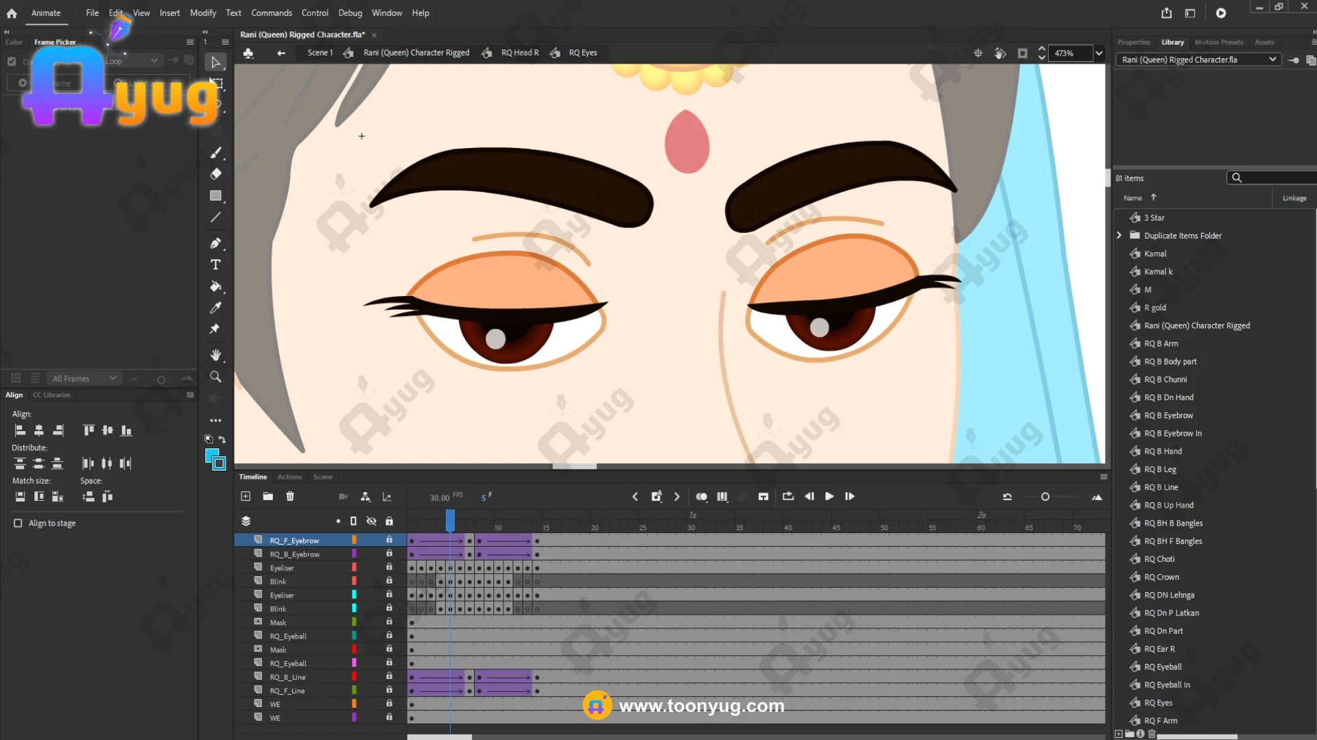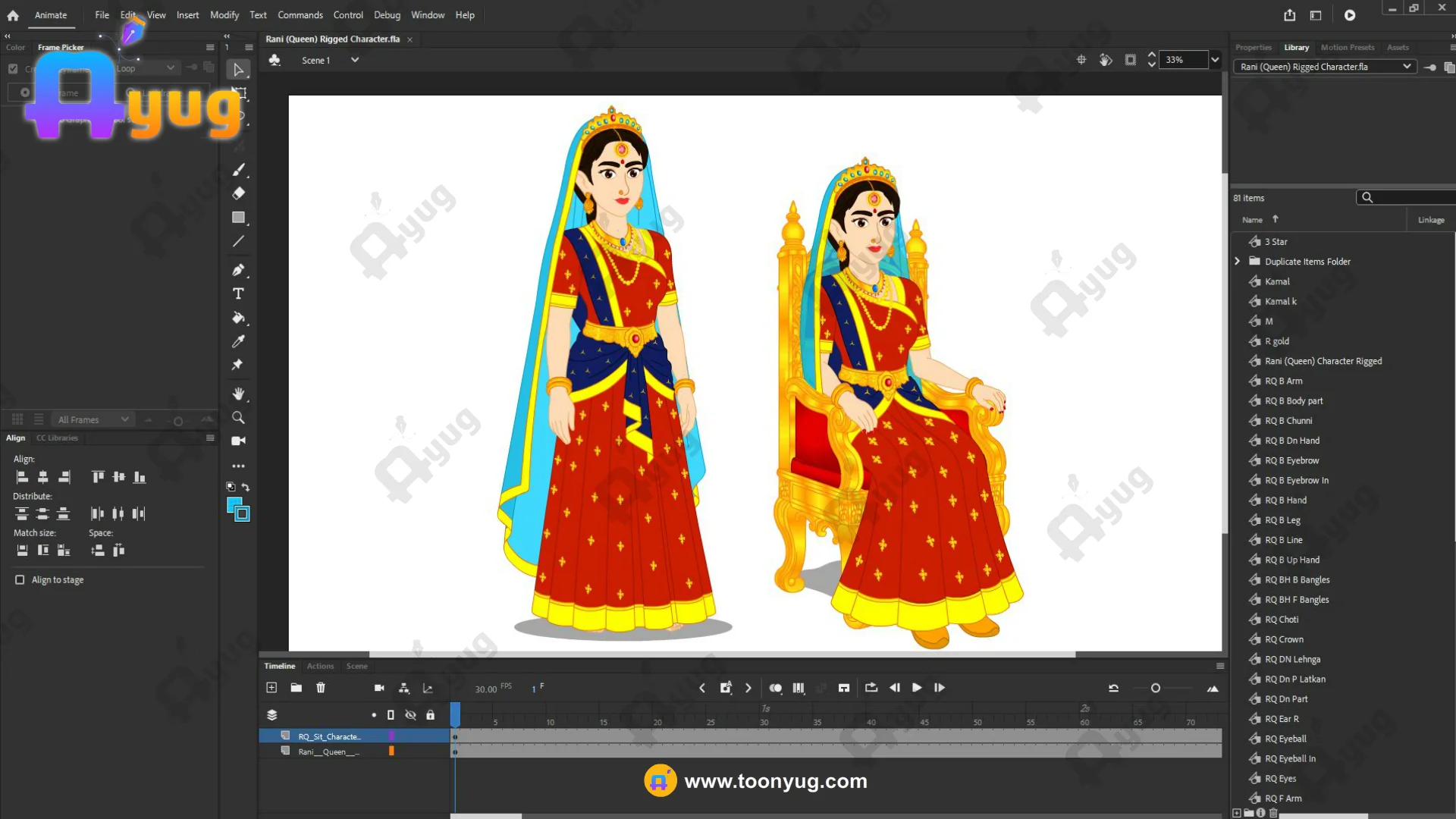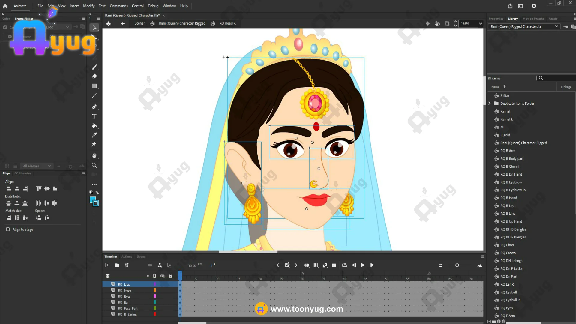 Cloth Physics: The hanging part of the blue sash and the saree pleats are on separate layers for smooth animation.