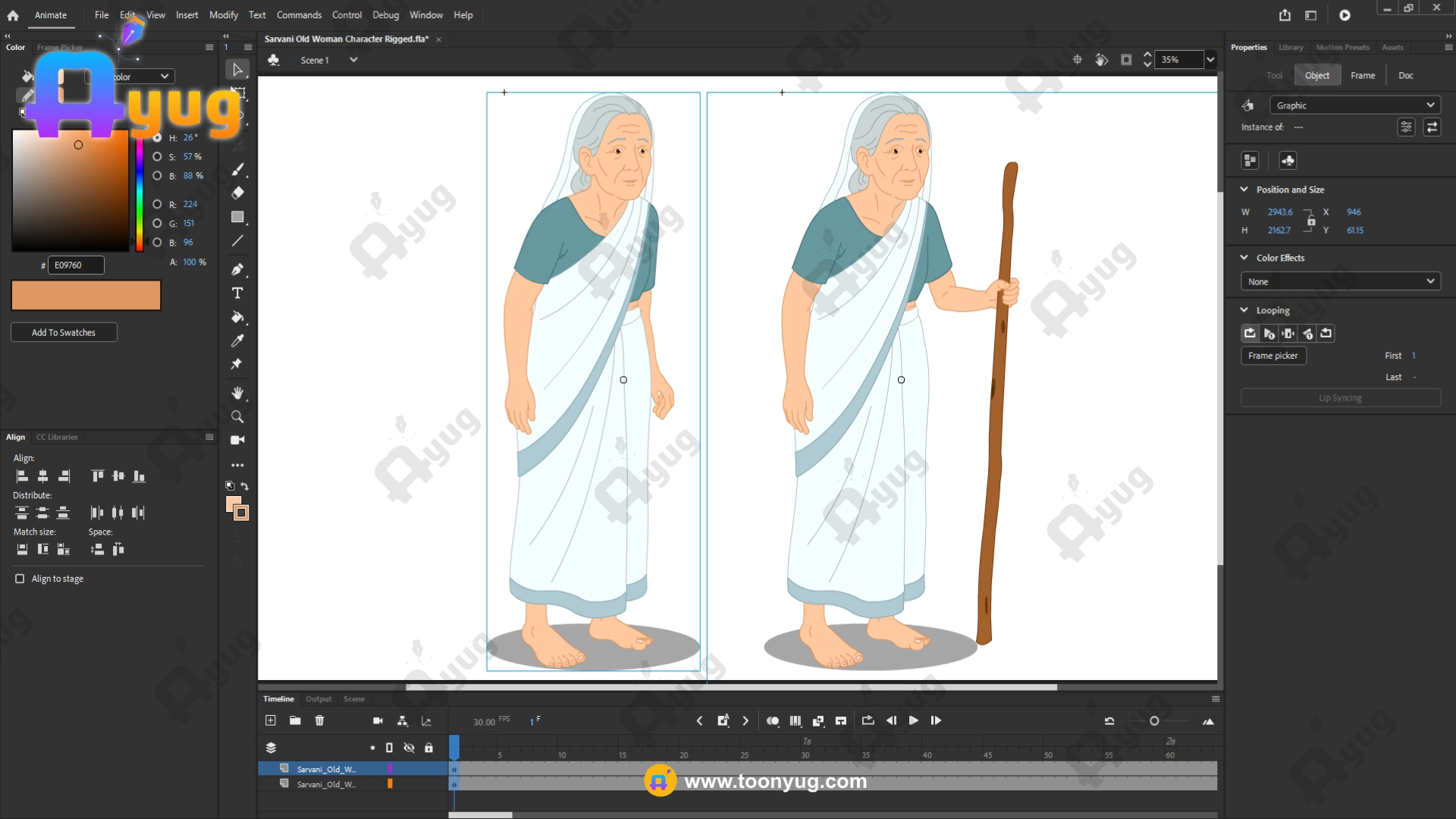 Stick Rig: The hand is attached to the stick on a separate layer/symbol, making it easy to animate the “walking with support” cycle.
