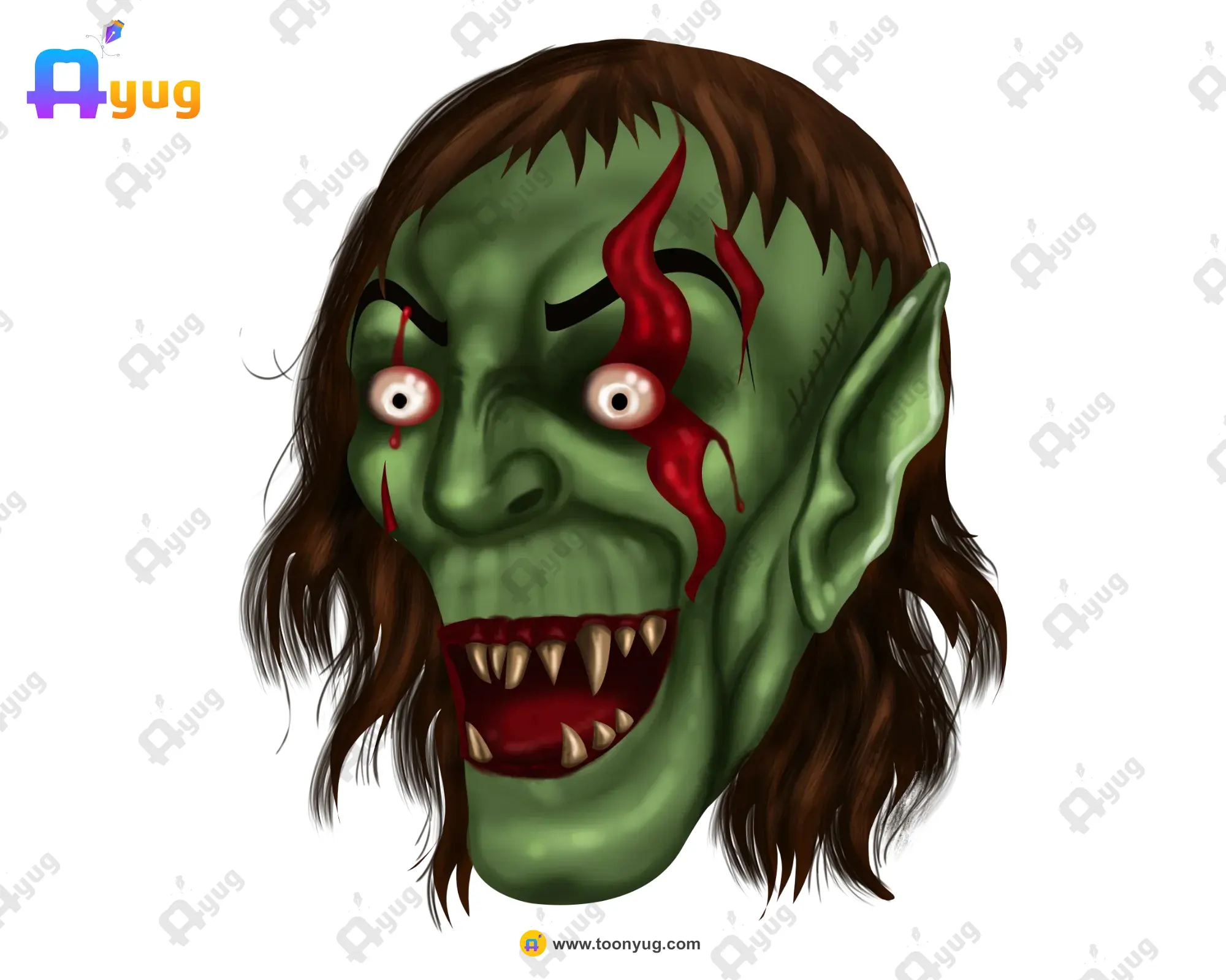 Monster Features: Pointed ears, messy hair, and a terrifying open mouth with sharp fangs.