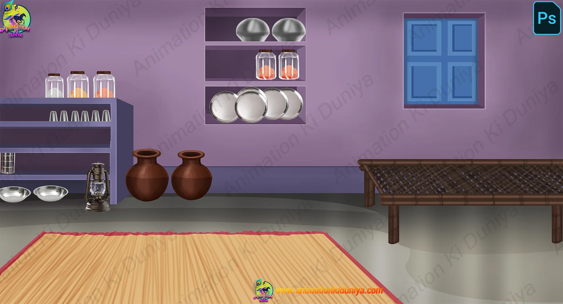 PSD की विशेषता: इसमें हर चीज़ (चारपाई, बर्तन, अलमारी) अलग-अलग लेयर्स पर है ताकि आप इसे आसानी से एनिमेट कर सकें।